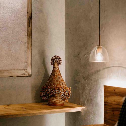 Finishes include lime-polished walls in local green tones characteristic of cantera stone, with the central courtyard highlighted in crimson. Vegetation is integrated throughout the design—patios, terraces, and walkways—to provide shade, freshness, and tranquility.