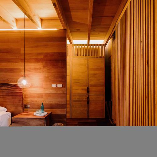 The ground floor features four rooms opening onto a central courtyard, which links the living/dining area, bar, and kitchen. This area utilizes a steel structure integrating cantera stone columns with wooden beams and terracotta bricks to support planters. A concrete staircase leads to the upper floor, where two bedroom pavilions were added. The junior room is closed and introspective, while the master bedroom opens entirely to terraces with views of Santo Domingo.